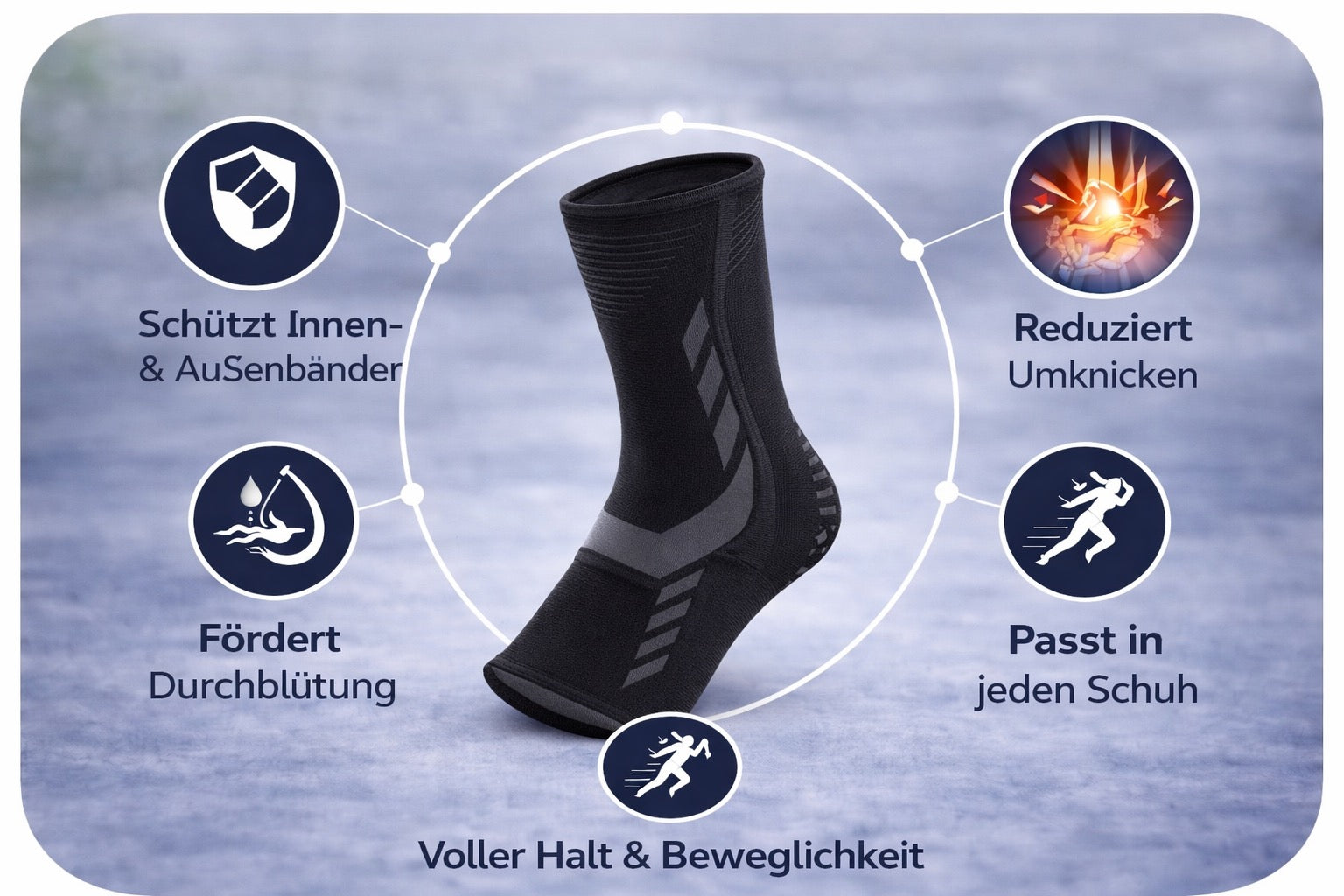 Durch die gleichmäßige Kompression wird das Sprunggelenk unterstützt, was viele Nutzer als angenehm bei Schmerzen, Steifheit oder Unsicherheitsgefühl empfinden – besonders im Alltag oder bei längeren Gehstrecken.