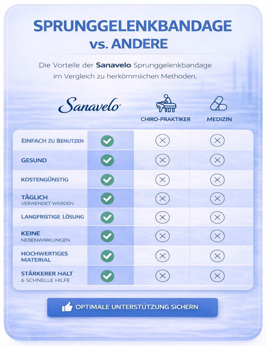 Die Sanavelo Sprunggelenkbandagebietet einesofortige, gezielte Stabilisierungdes Sprunggelenks – ganz ohne Termine, Medikamente oder lange Behandlungswege. Im Gegensatz zu vielen anderen Methoden ist siejederzeit einsatzbereit,kostengünstigund kanntäglich im Alltag und beim Sportgetragen werden. Durch diegleichmäßige Kompression und den sicheren Haltwerden Innen- und Außenbänder gleichzeitig unterstützt, was das Risiko von erneutem Umknicken deutlich reduzieren kann. Zudem ist Ankleviafrei von Nebenwirkungen, angenehm zu tragen und bietet einepraktische, langfristige Lösungfür Menschen mit empfindlichen oder instabilen Sprunggelenken.
